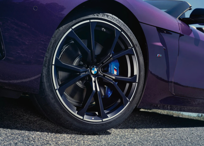 Les freins M Sport de la BMW Z4 garantissent une puissance de freinage exceptionnelle. Dotés d’étriers fixes à quatre pistons à l’avant et d’étriers flottants mono-piston à l’arrière, ils assurent une réactivité et une maîtrise optimales, même en conduite dynamique. Leurs disques surdimensionnés offrent un freinage ultra-performant, tandis que leur finition bleue avec logo M souligne l’ADN sportif du roadster.